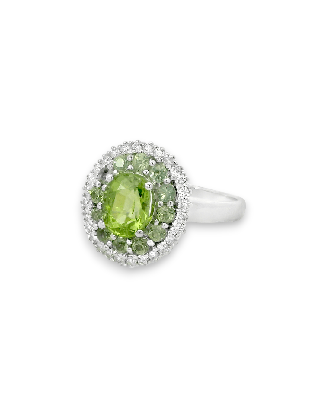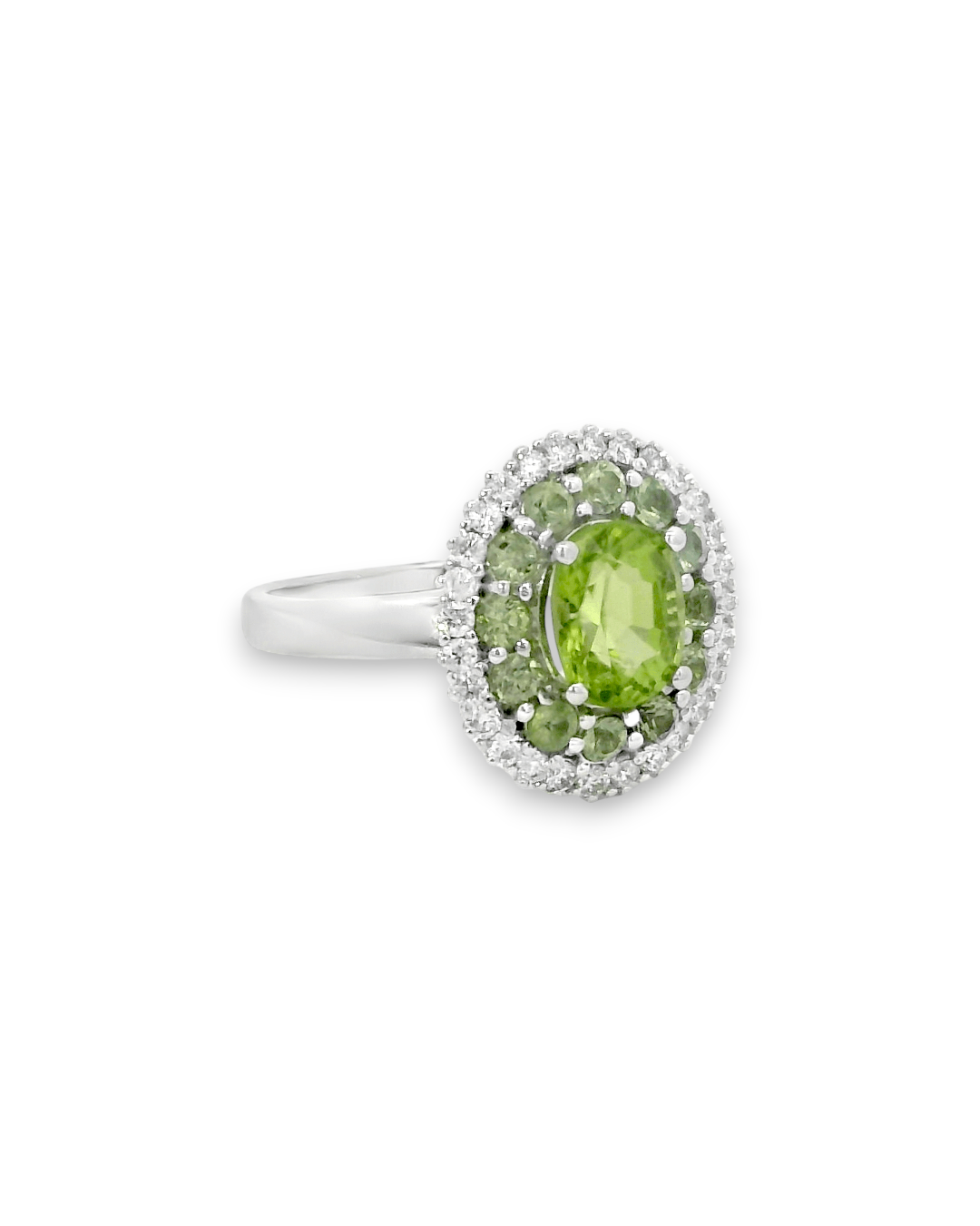 A halo ring set with a natural peridot, surrounded by green gemstones and finished with a white diamond outer halo. The layered design highlights the fresh green colour while remaining comfortable for everyday wear.