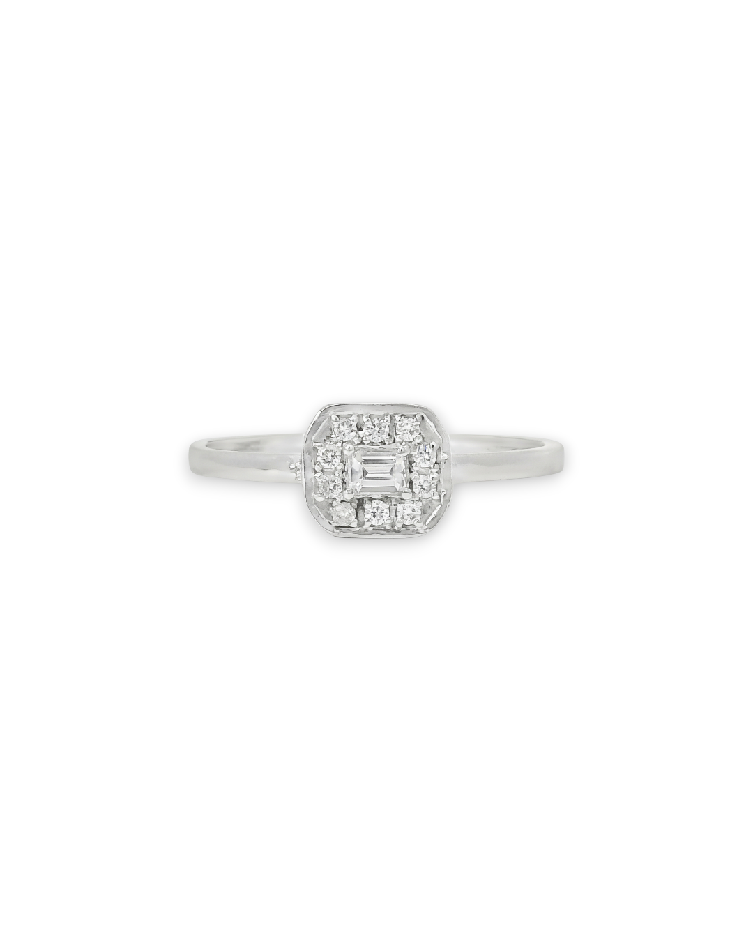 This halo ring features a natural baguette diamond, surrounded by round diamond melees .