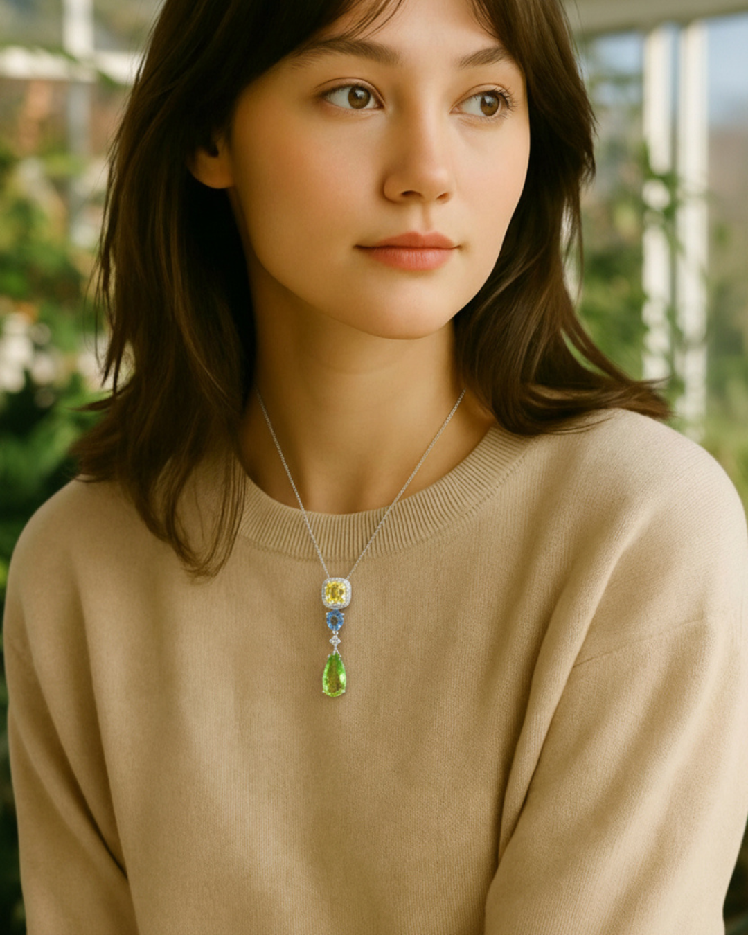 A vertical drop pendant set with three natural gemstones, designed to sit comfortably and move naturally when worn. Details: